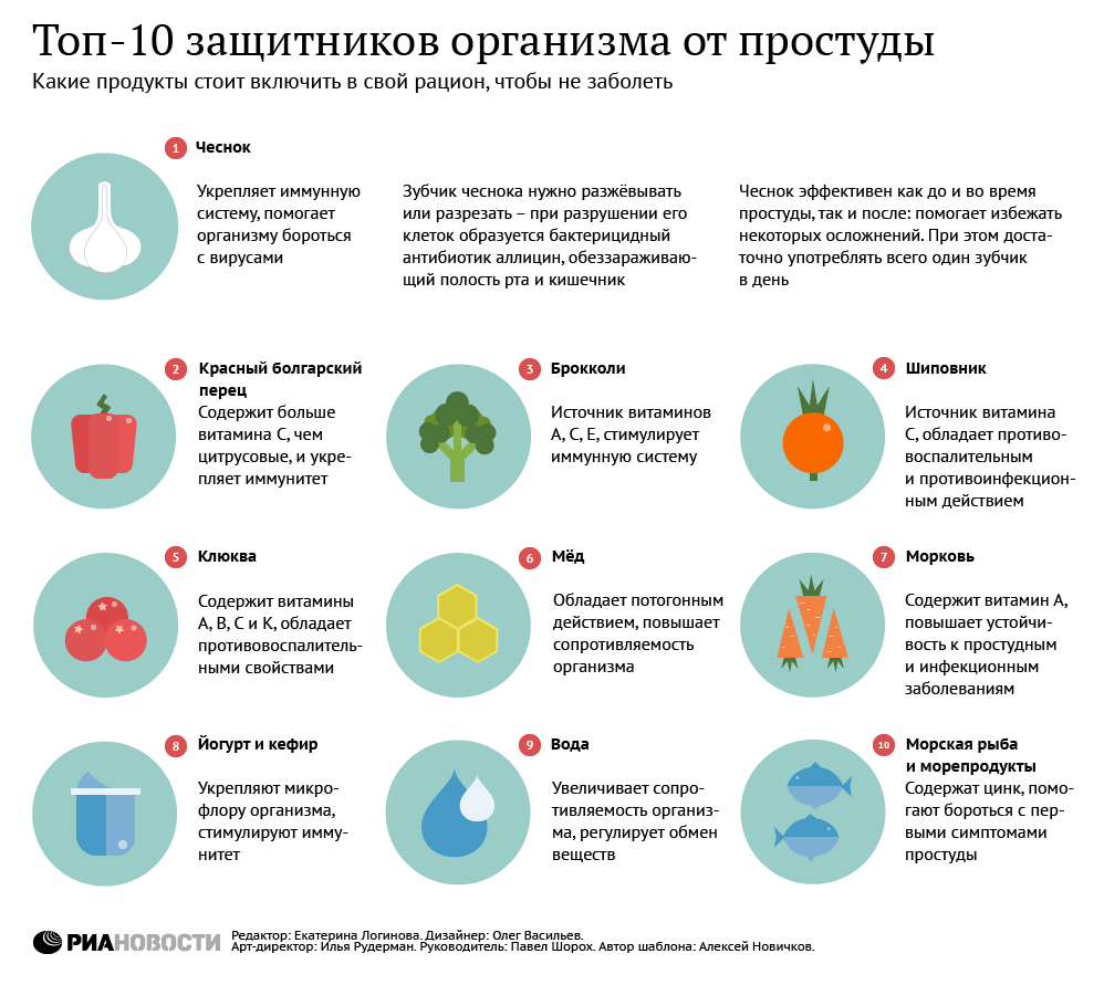 • Ешьте цитрусовые, сладкий перец, молочные и кисломолочные продукты, твердые сыры, отварную рыбу, говядину, морковь со сметаной, изюмом или курагой. Витамины А, С, цинк и кальций, содержащиеся в этих продуктах, предупреждают простуды и облегчают их лечение. Но в острый период болезни не пейте молоко — оно затягивает лечение.